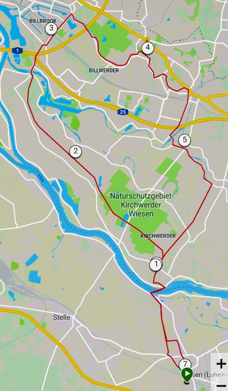 Der ersten Teil der Strecke ist unser üblicher Weg nach Hamburg. Die Marschenbahndamm Strecke verläuft mitten durch Felder und Wiesen und ist meistens durch Bäume und hohe Büsche gut beschattet. Spätestens bei IKEA ist es vorbei mit der Ruhe.