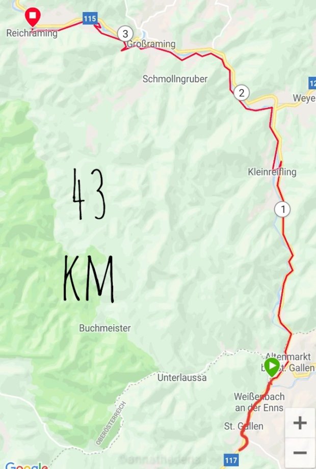 Es kam was kommen musste, es wurde leider immer ungemütlicher, und zwar nicht vom Wetter her. Ohne Radweg, auf der Bundesstraße und ungeduldige Autofahrer, ließen ab Hieflau immer mehr Frust aufkommen. Es fühlt sich sehr bedrohlich an, wenn man mit geringem Tempo bergauf strampelt und Holzlaster und Autos gleichermaßen eng an einem vorbei heizen 😳 Da wird einem schon mulmig…und rechts ging es tief runter…🤮