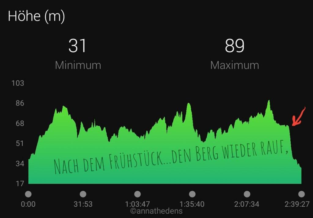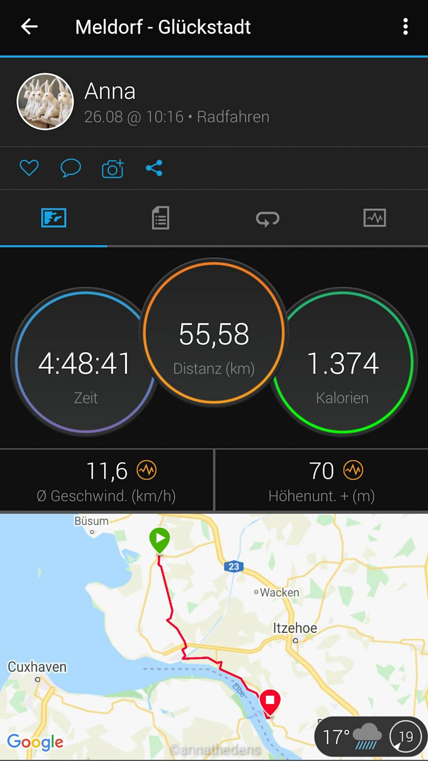 Die letzten sechs Kilometer fuhren sich (fast) von alleine. Was für eine tolle Tour! Was für ein toller Abschluss Tag. So schön, dass das Wetter sich heute von der sehr angenehmen Seite gezeigt hat. Wie die Statistik gleich zeigt, sind wir 90 Kilometer geradelt, aber die gestrigen 50 waren so viel anstrengender.