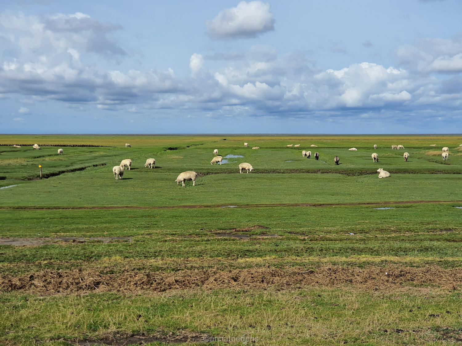 Am heutigen Radeltag haben wir aber noch ausgiebig die Küste mit der einzigartigen Wattlandschaft, trotz Gegenwind, genossen. Richtung Süden am Deichfuß entlang…viel Schaf und viel Watt…