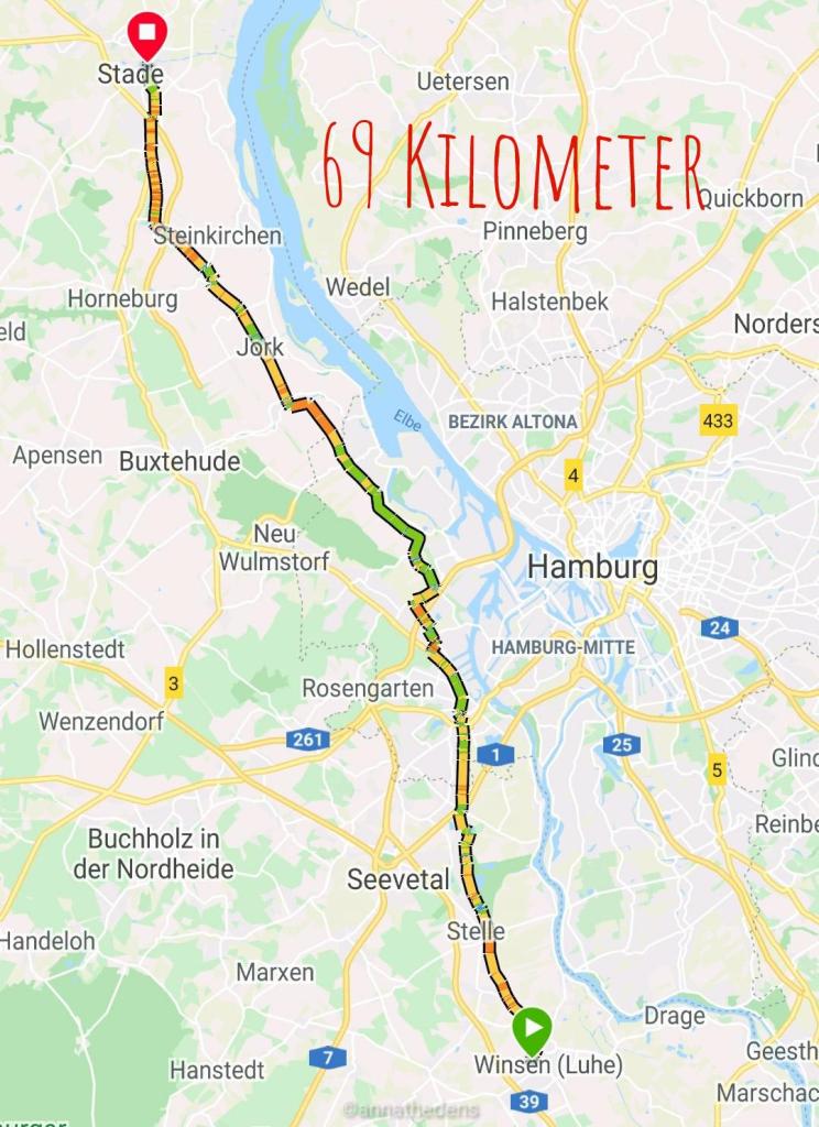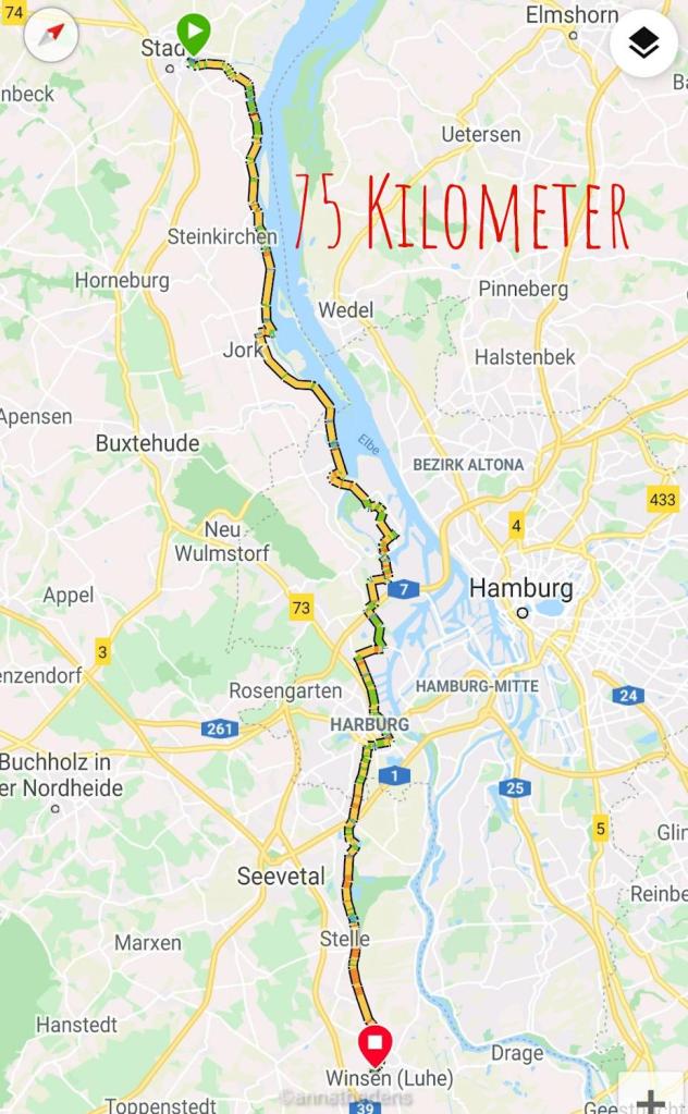 Ganz zufriedenstellend ist die Streckenführung nicht gewesen, aber das liegt an dem Industriegebiet Harburg…das kann man sich einfach nicht weg wünschen. Der Hinweg war die direkteste Route, leider auch die lauteste…aber man kann nicht alles haben.