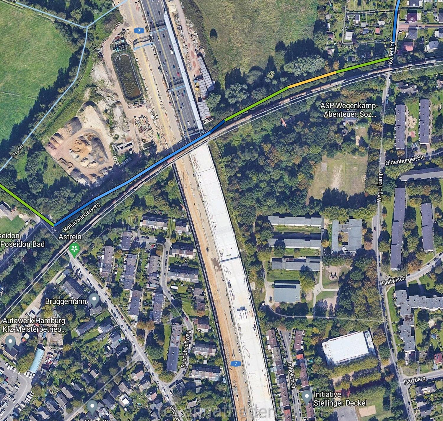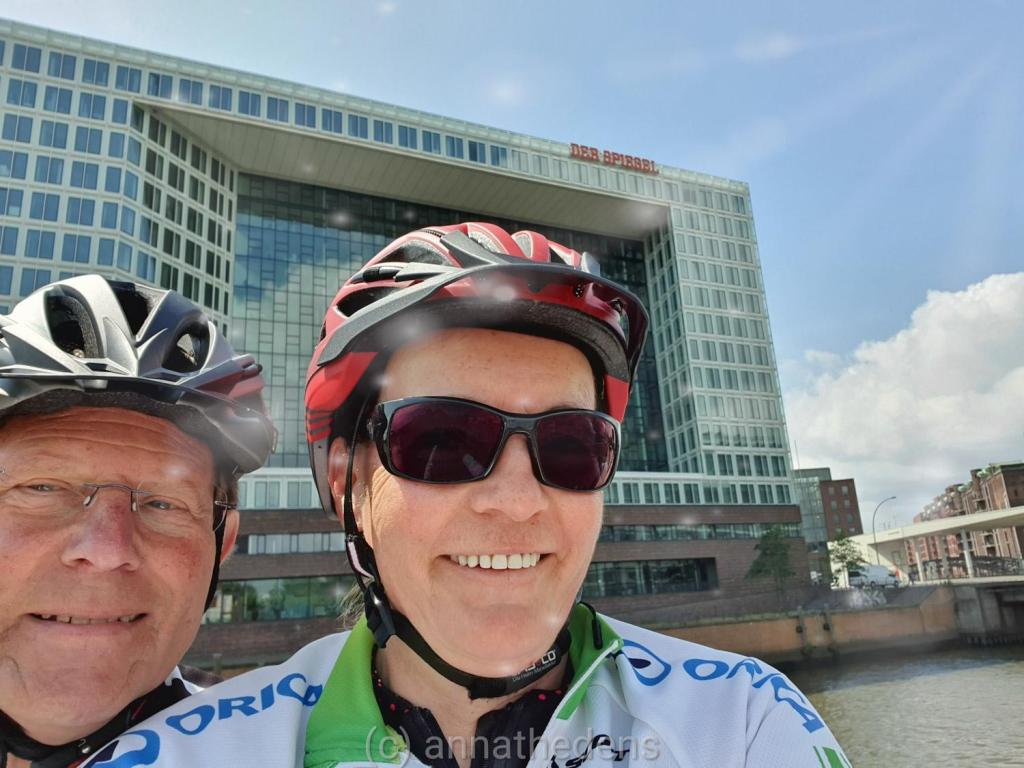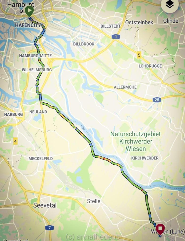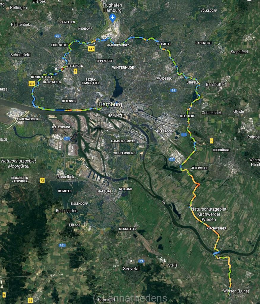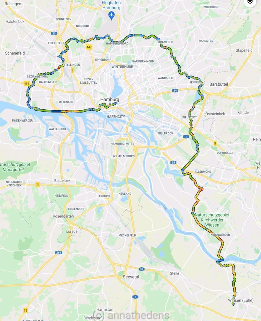 Mit dem Zug sind wir bis zum Hamburger Hauptbahnhof gefahren, um dann zunächst zur Elbe und weiter bis Teufelsbrück zum eigentlichen Startpunkt des grünen Rings zu kommen. Dass schon nach den ersten 10 Kilometern eine fiese Schikane eingebaut war, hat uns zwar kräftig schnaufen lassen, aber nicht an weiteren Taten gehindert! Der schöne, und ebene Elbradweg fand kurz vor Teufelsbrück ein plötzliches Ende. Baustelle! Wie kann es auch anders sein. Ganz Hamburg ist gefühlt eine große Baustelle. Also 2 Kilometer zurück 🙄 und dann ging es steil nach oben 🥵