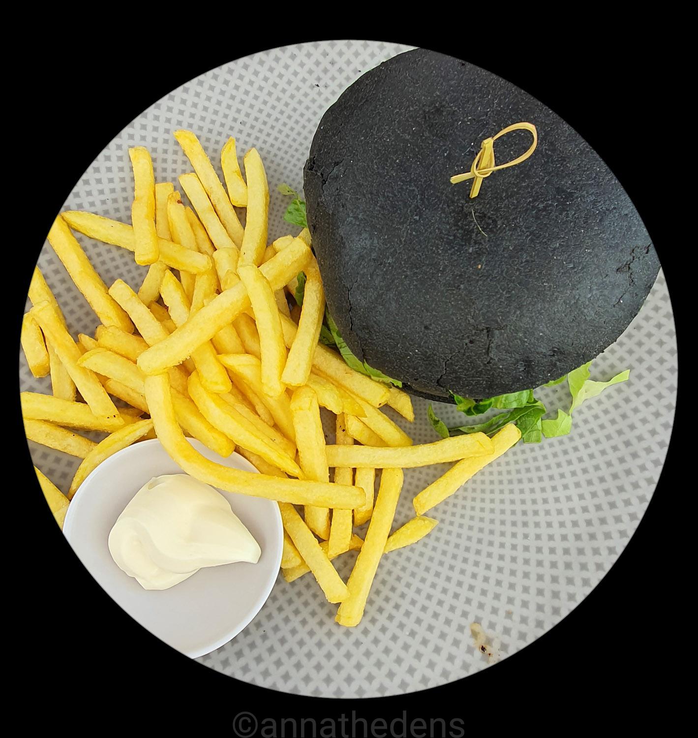 Was aussieht wie ein verkohltes Etwas, ist ein mit Sepia Tinte gefärbter, sehr leckerer Burger!