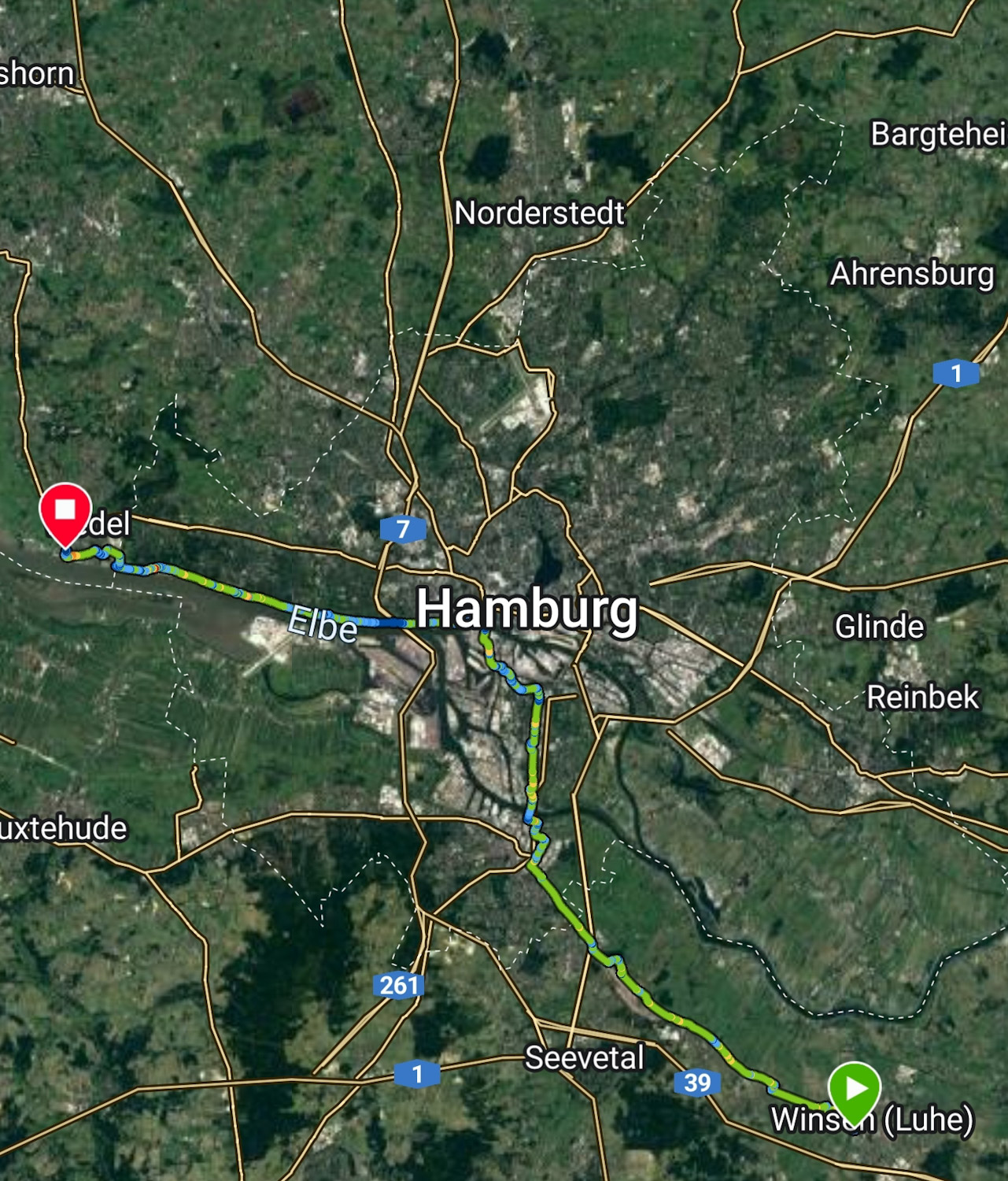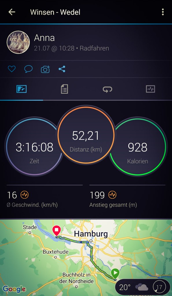 Wir waren schon fast an der alten Dreckschleuder von (Umwelt) Senator Kerstan…also dem uralten, dreckigen Kohle Kraftwerk, das Hamburg immer noch mit Fernwärme beliefert, wohingegen das modernste Kohle Kraftwerk in Moorburg, das nie ans Fernwärme Netz angeschlossen wurde und mittlerweile sogar abgeschaltet ist, als über der Elbe ein mächtiger Schauer runterging…gefühlt in 500 Metern Entfernung. Nachdem wir in aller Schnelle die Regensachen übergestreift hatten, sind wir mutig weiter geradelt. Es hat nicht lange gedauert, bis wir nass waren…so von innen. Es war schwitzig unter dem Cape, aber von Regen war wenig zu sehen…einige wenige Tropfen. In Wedel haben schließlich große Pfützen gesehen. Der Regen war schneller als wir. Das Cape haben wir vor dem steilen Schiebeanstieg am Kraftwerk wieder in der Versenkung verschwinden lassen.