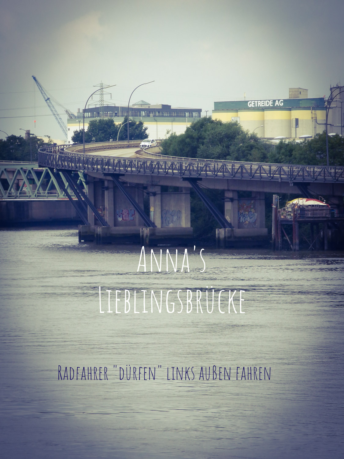 So sind wir im Trockenen gestartet und waren schnell auf altbekannten Wegen, über die sehr schöne Alte Süderelbbrücke (Radfahreres Traum) in Harburg, dann Wilhelmsburg, wo wir an „Ernst-August seinem Kanal“ nicht wie üblich rechts abgebogen sind. Diemal fuhren wir geradeaus…zur fiesesten Fahrradbrücke überhaupt, die man aber bewältigen muss, um auf kurzem Weg zum Alten Elbtunnel zu gelangen. Der ist übrigens ein „cooler“ Tipp für heiße Tage. Dort ist es ähnlich erfrischend, wie in den Katakomben vom Berliner Dom.