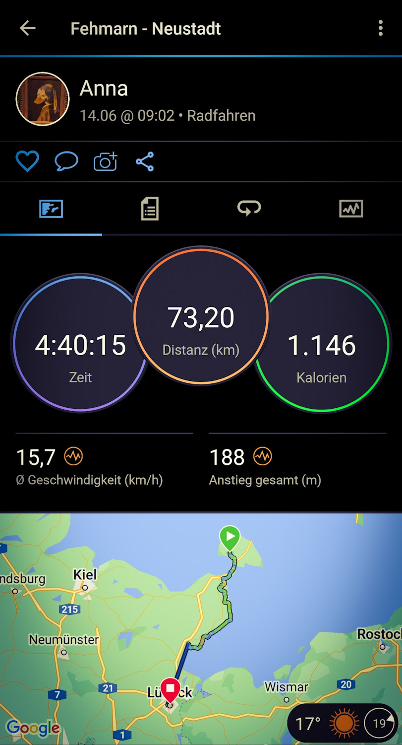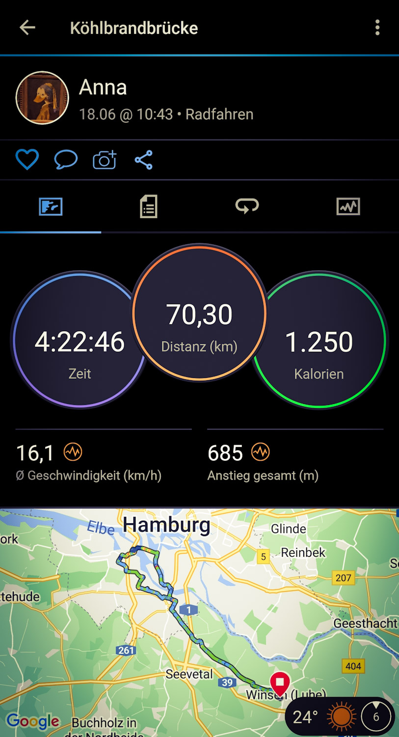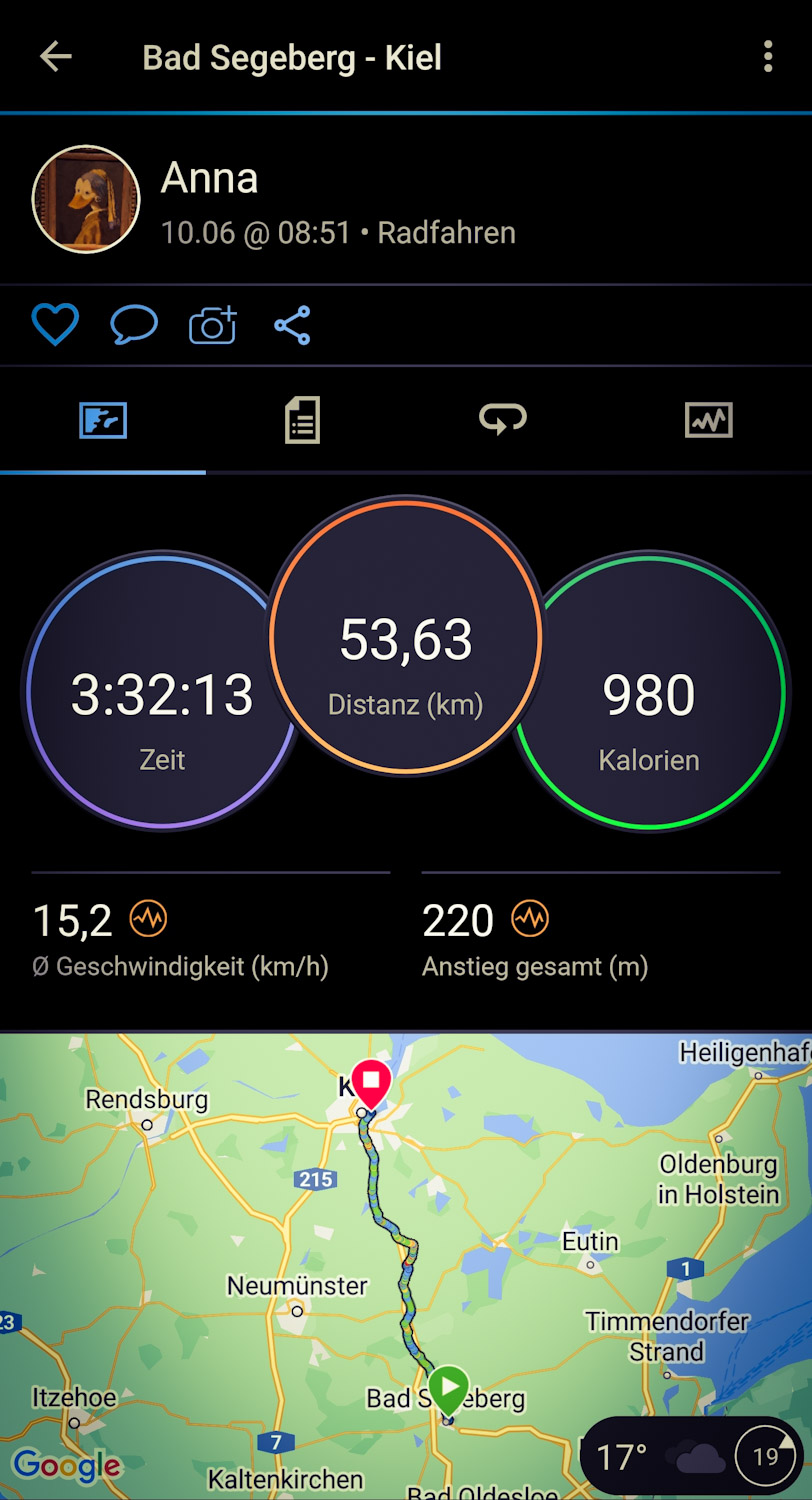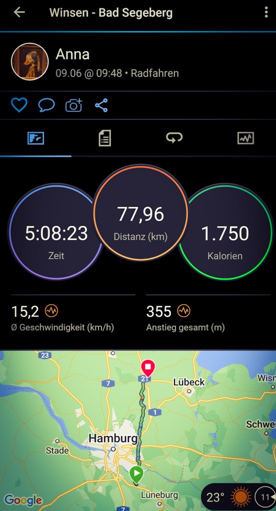 In Harburg haben wir noch ein Erfrischungs Getränk beim Vietnamesen „Hai An“ genossen. Immer wieder toll und sehr belebend bei dem heißen Wetter. Auftanken für die letzten 20 Kilometer. Nun noch etwas Statistik…