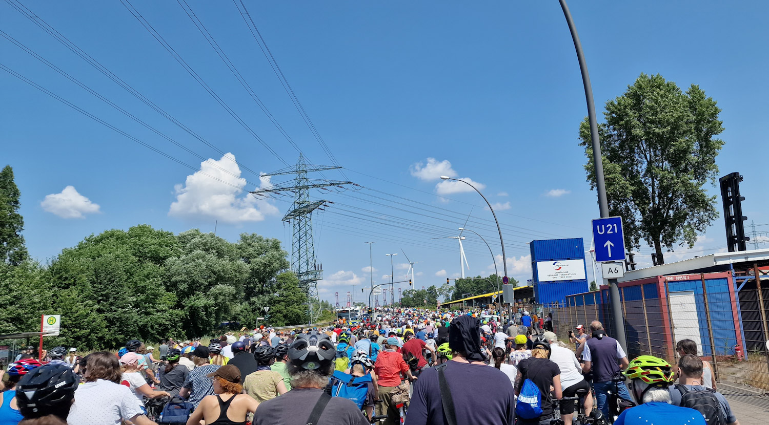 Blauer Himmel und warme – später heiße – Temperaturen, ein tolles Wetter für die Veranstaltung, die bis zum Hamburger Rathaus führte, wo die Veranstalter für bessere Bedingungen für Radfahrer demonstrierten. Mir würde es schon reichen, wenn die vorhandenen Verkehrsregeln eingehalten werden…von beiden Seiten 🥴