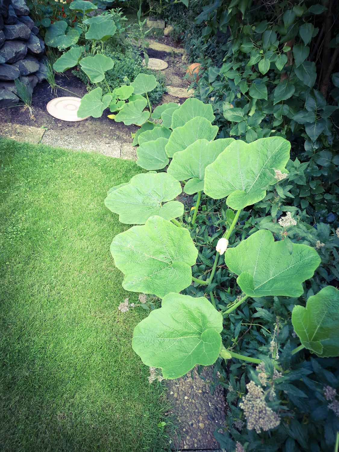 Neue BepflanzungHerrlicher Wildwuchs um das KräuterbeetJeden freien Platz nutzenDas werden vielleicht RiesenkürbisseGrünkohl im Gemüsebeet