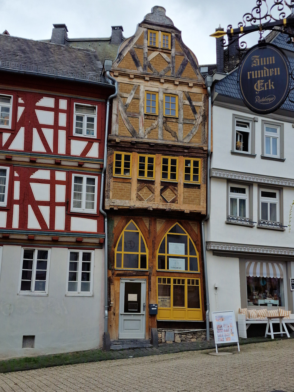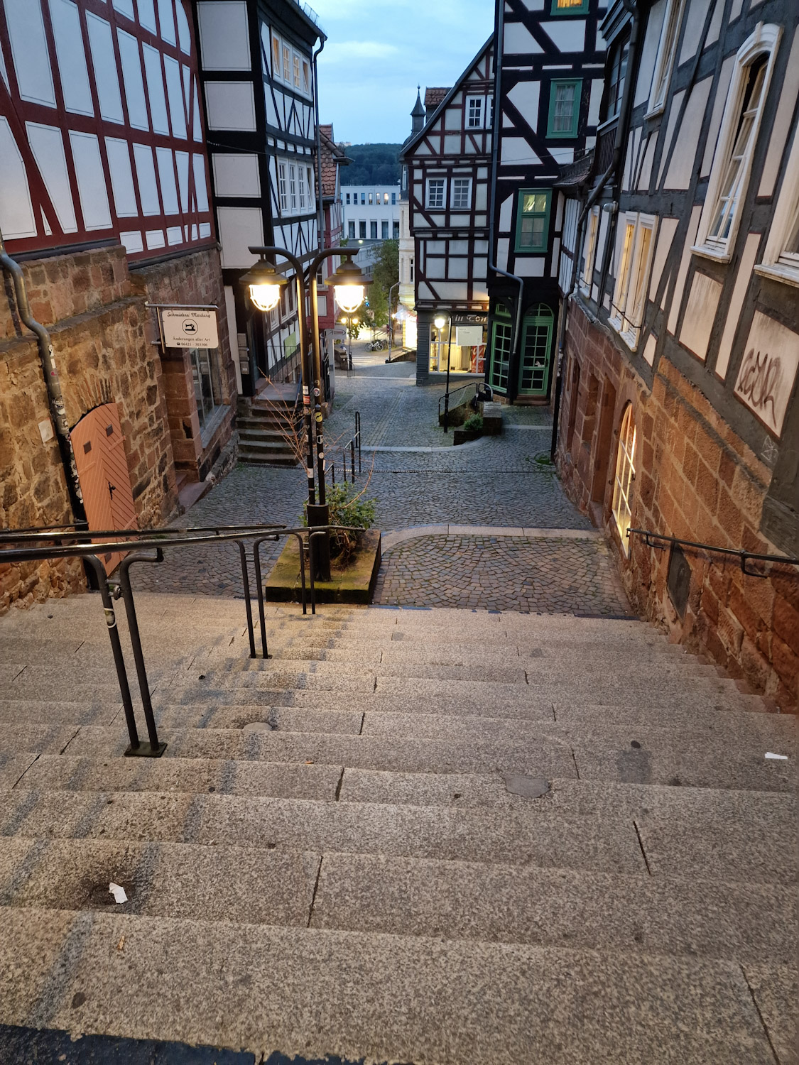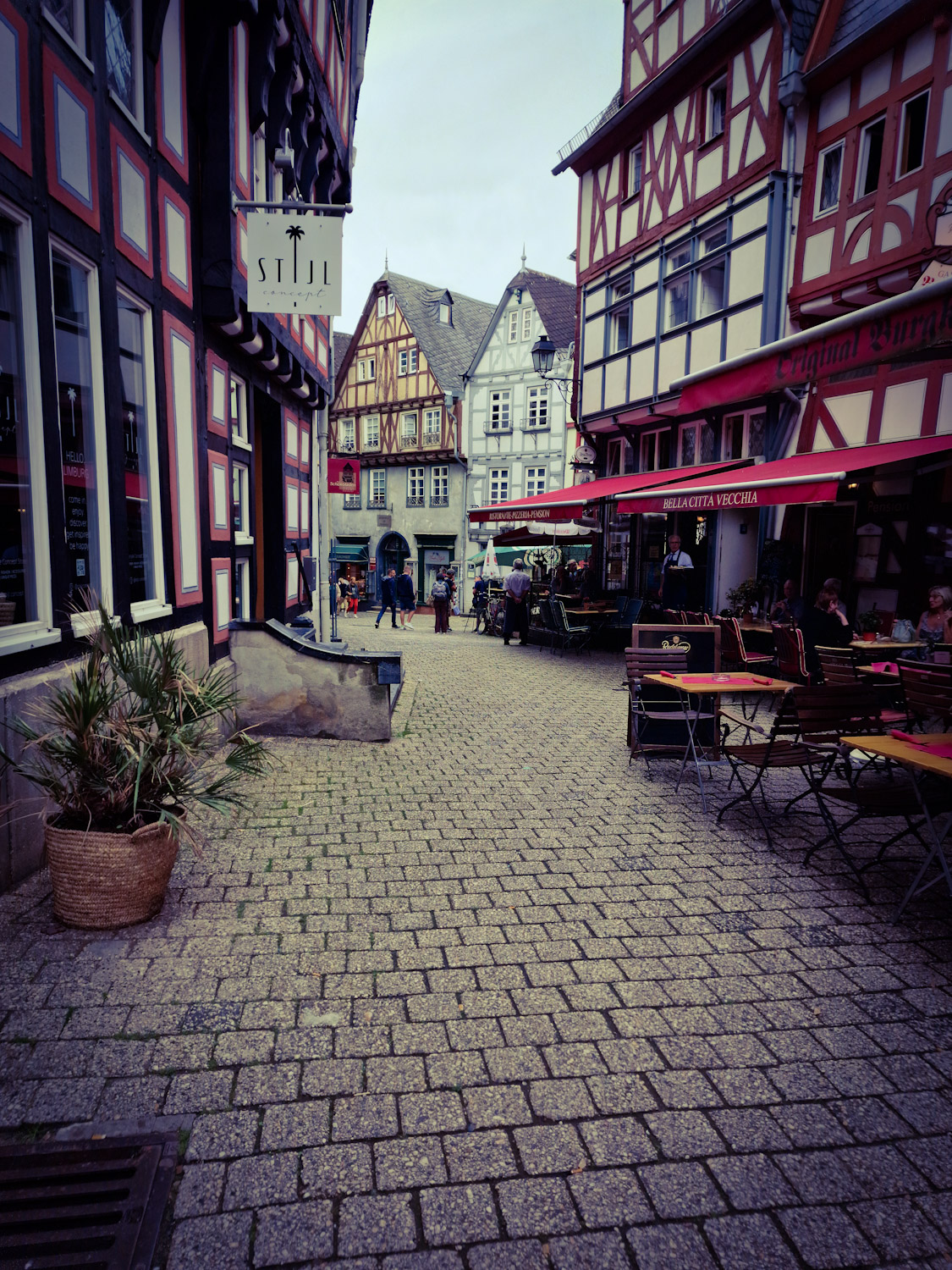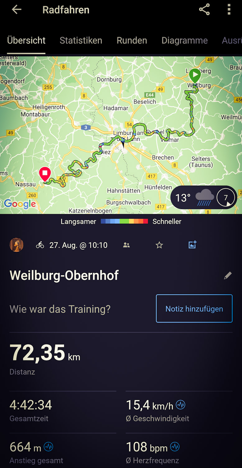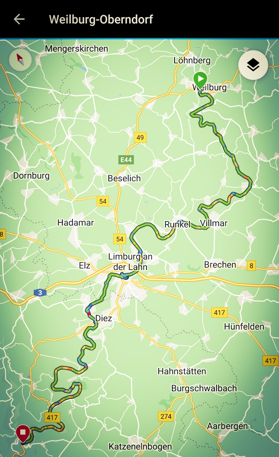 Beim Frühstück hat es geregnet. Stört dann aber überhaupt nicht. Ein paar wenige Tropfen gab es später noch einmal, aber nicht viel, und schon gar nicht lange. Da wir dem Regen entgegengefuhren, war das Thema schnell durch. Die Wegstrecke war heute durchweg positiv…als wir aus Weilburg heraus fanden. Gestern haben wir entgegen unserer sonstigen Bergleistungen, den Fahrstuhl zur Altstadt, bzw. zu unserem Hotel genommen. Heute haben wir festgestellt, daß unser Hotel in den Hang gebaut ist, und dass man auch relativ bequem ohne Altstadt Fahrstuhl dort hin kommt 😅