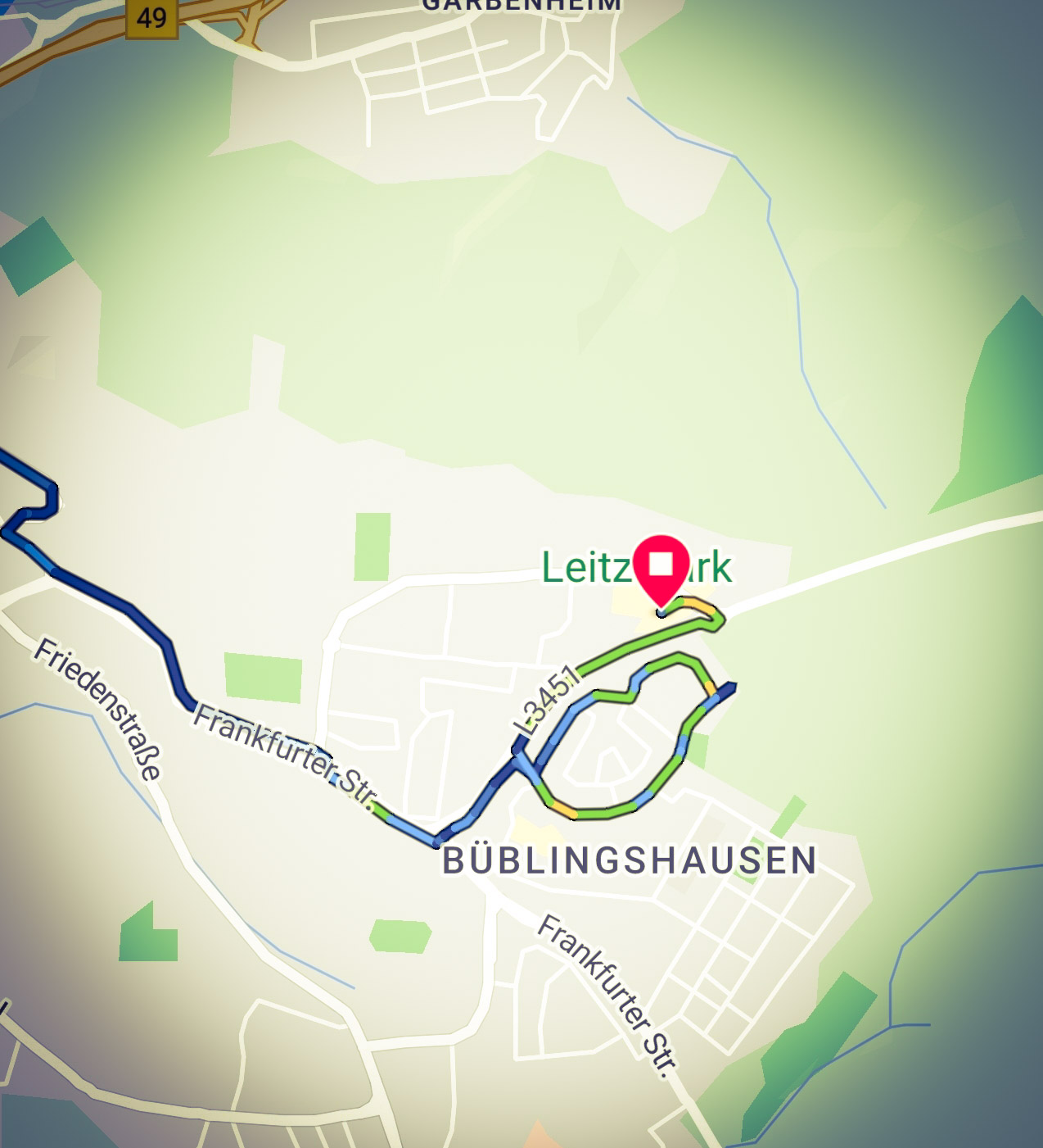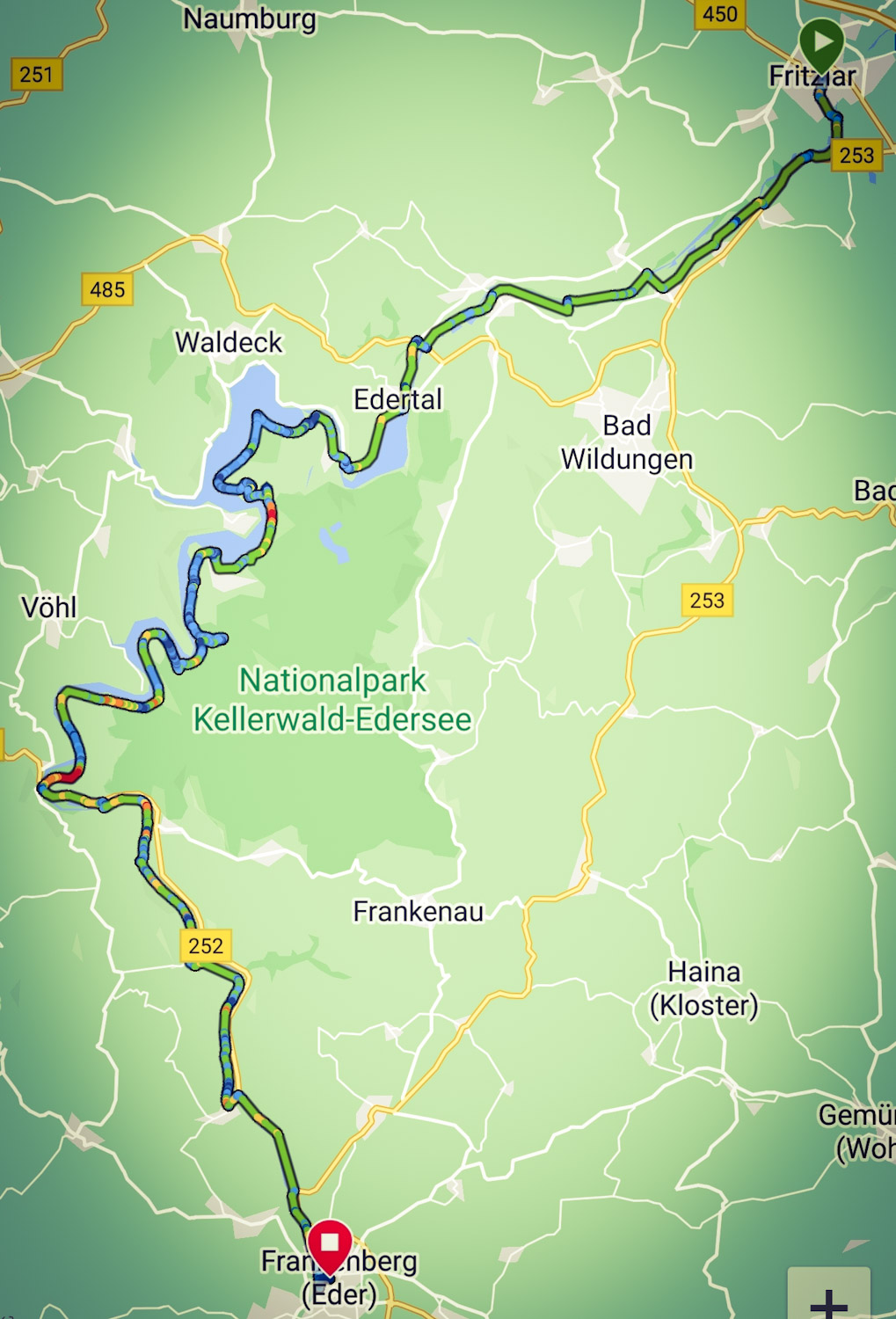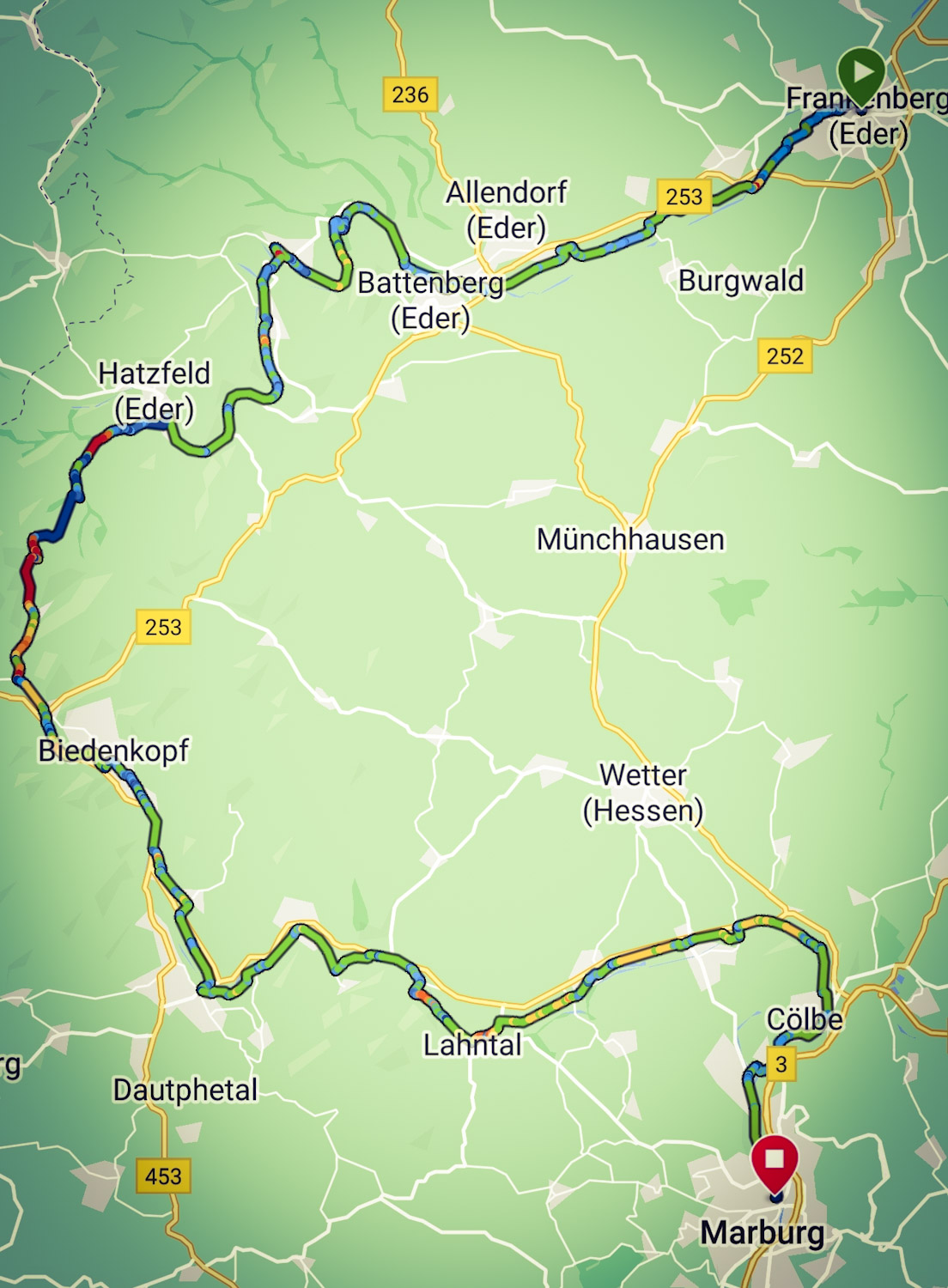 Gestern waren einige wenige Teilstücke schon gewöhnungsbedürftig. Mit weniger Aufmerksamkeit findet man sich schnell auf der Autobahn nach Frankfurt wieder…was schon häufig vorgekommen ist, wie eine hinter uns fahrende Frau erklärt hat.