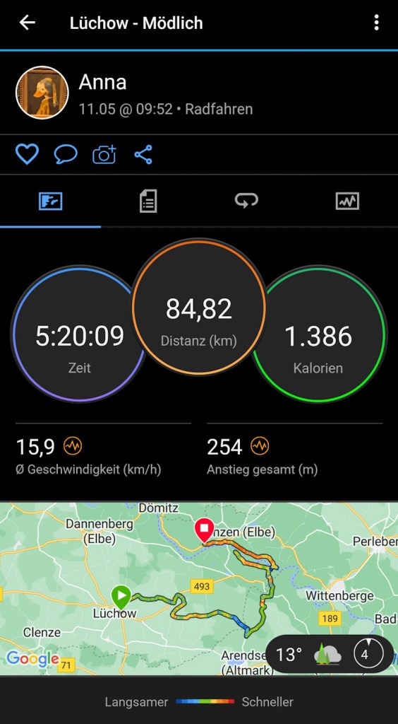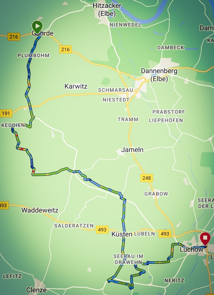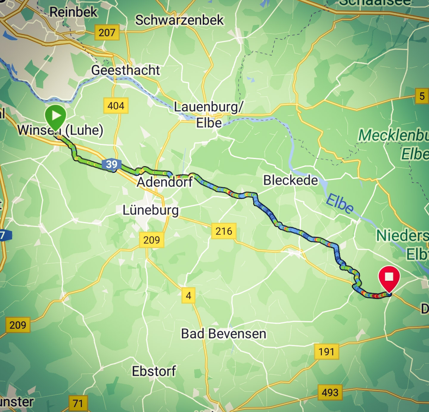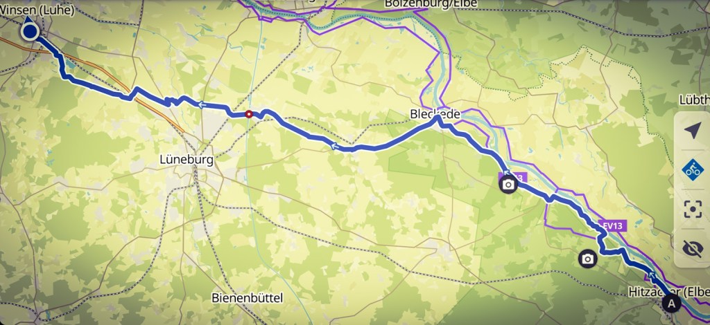 Das Frühstück im Truckerstop war ok. Es hat genügend Kraft gegeben, uns und unsere Muskeln zu motivieren weitere Steigungen in Angriff zu nehmen. Heute aber auf Asphaltwegen und mit etwas weniger Gegenwind. Über den sind wir gar mehr nicht so böse, da wir deswegen trocken bis Lüchow gekommen sind. Der Wind 🌬️ hat das Regentief nicht an uns heran kommen lassen👍