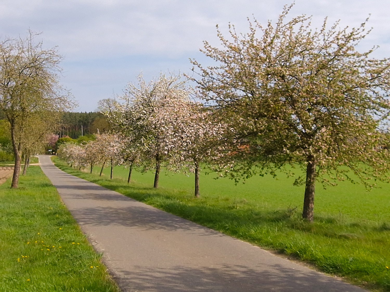 blühende ObstbäumeGlück gehabtweite Felder mit Bauminselnheute schöne Abfahrt