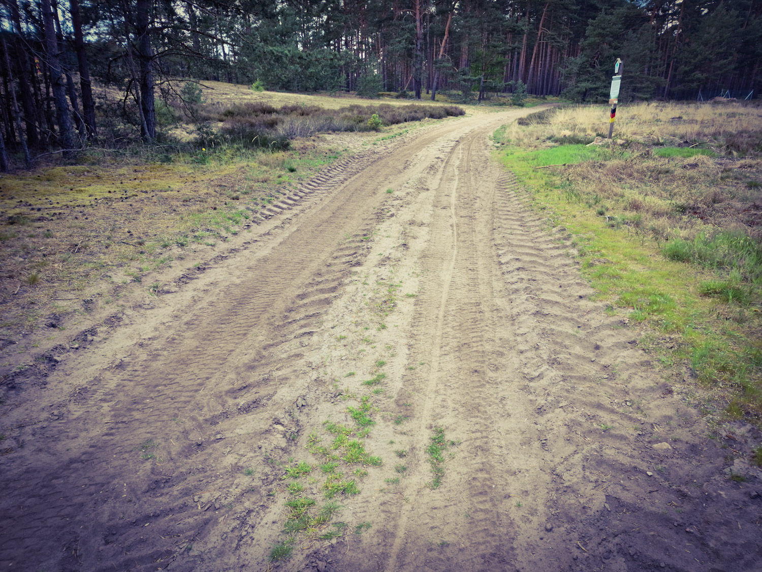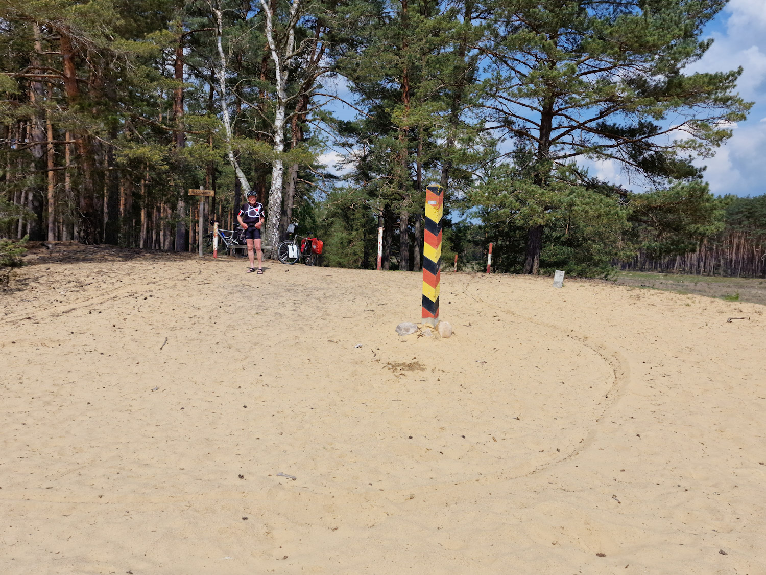 Wir hingen noch so unseren Träumen nach…plums, da lag eine neue Realität in Form einer Sandpiste vor uns…Asphaltende, Sandpiste voraus…und was für eine. Anfangs noch fahrtauglich, was Uwe noch zu der Bemerkung hinreißen ließ, „Da kennen wir weitaus schlechtere.“ Was dann leider auch so kam. Wir fuhren, oder schoben parallel zur ehemaligen Zonengrenze die definitiv keinerlei Förderung bekommen hatte. 3 lange Kilometer, von Wirl bis zum Grünen Band, früher bekannt als Todesstreifen.