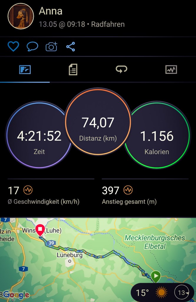 Zum Schluß die Statistik…es war teilweise ungewohnt warm mit 27 Grad…gefühlt viel mehr, besonders am Klingenberg, aber ein gelungener Start für unsere Holstein Tour (ohne Schleswig-)!