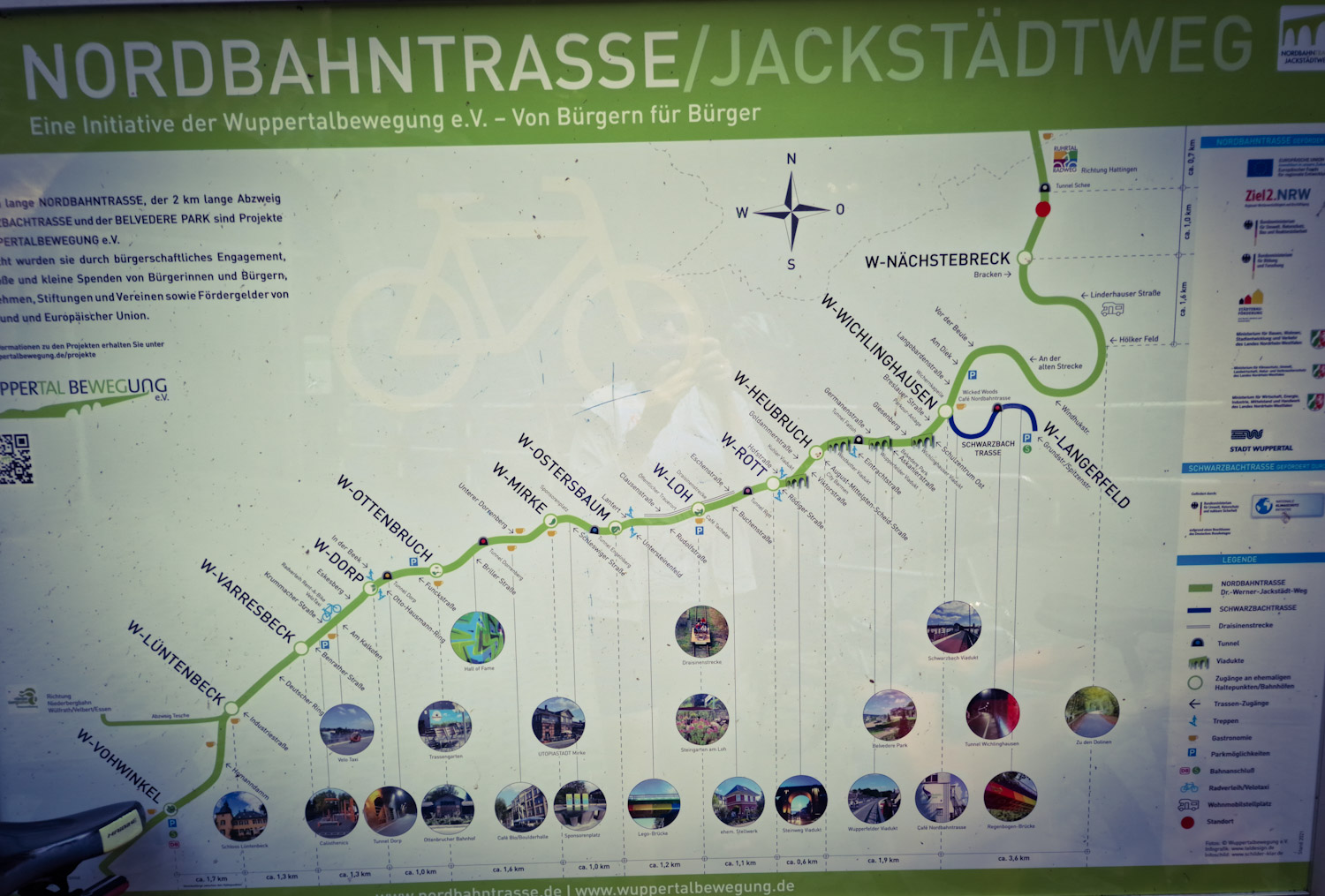 Uns war ja klar, dass es gleich wieder steil nach oben ging. Den Anstieg zu der schönen Nordbahntrasse haben wir aber gerne in Kauf genommen. Die nächsten 20 schönen Kilometer sind wir gemächlich gen Vohwinkel gerollt…sind auf die Korkenzieher Bahntrasse gewechselt…die ebenso schön dahin rollt. Leider gab es ein ziemlich böses, bzw. schweißtreibendes Erwachen.